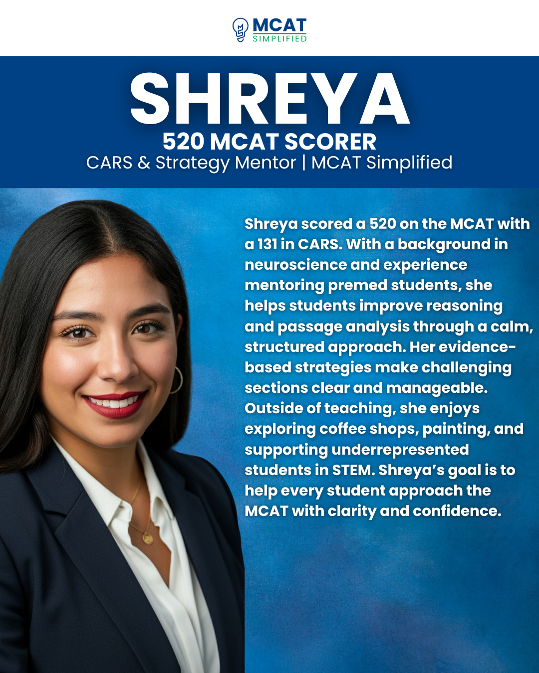 Jennifer and the team at MCAT Simplified helped me realize that success wasn’t about grinding endless hours. It was about studying smarter. Her CARS strategies were a complete game-changer. I went from panicking at every passage to actually enjoying the logic puzzle behind them. Scoring a 520 felt impossible just a few months ago, but with their support and accountability, I got there. I’ll forever be grateful.