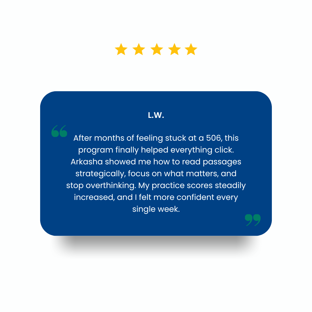 He has helped hundreds of students improve their passage approach, timing, and overall confidence by focusing on strategy first, not memorization.